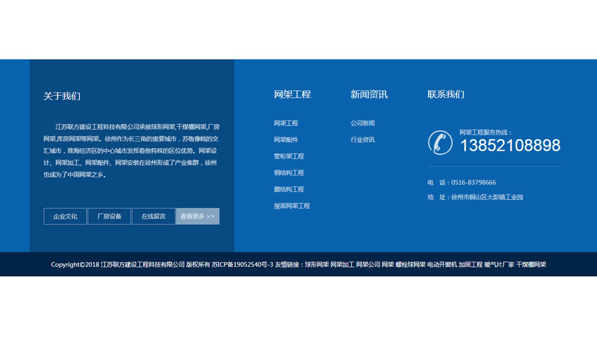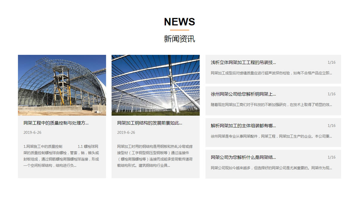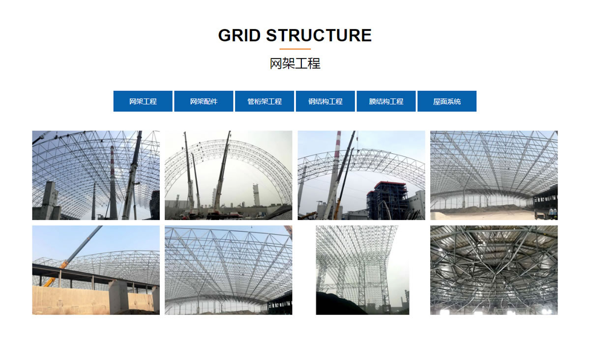 江苏联方建设工程科技有限公司承接球形网架,干煤棚网架,厂房网架,库房网架等网架。是专业设计、制作、安装网架结构,轻钢结构,管桁架钢结构,及其配件的科技进步企业。
